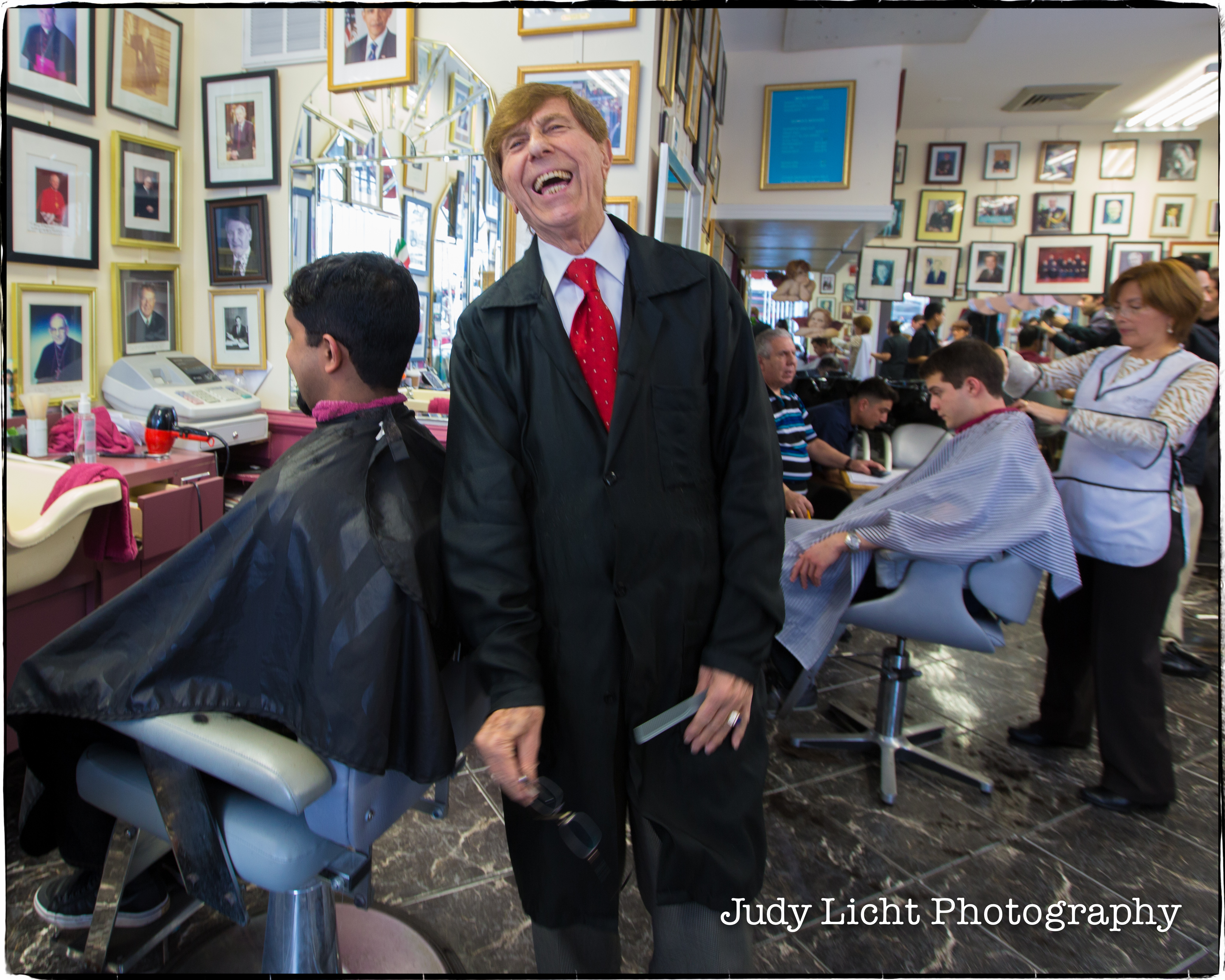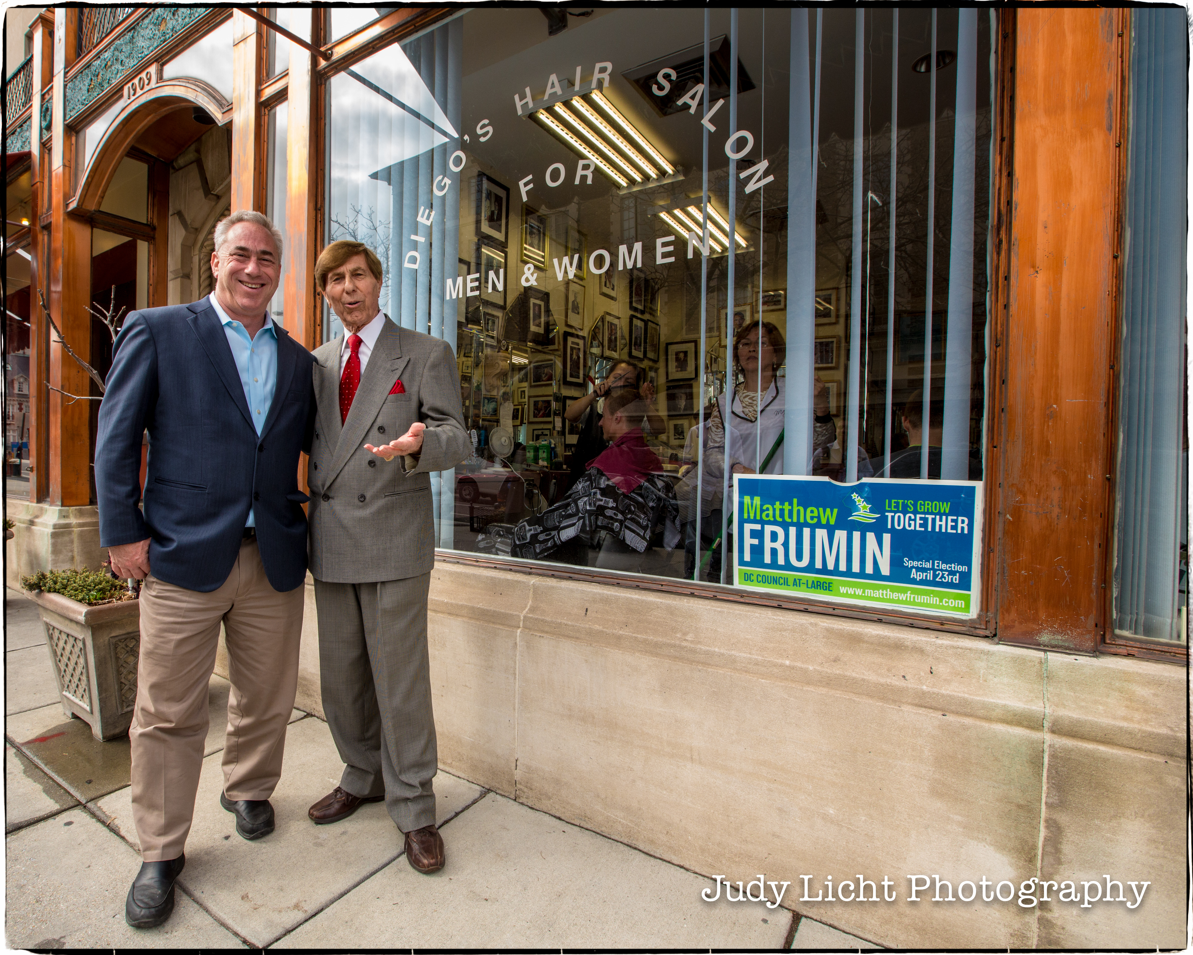 Posted: March 14, 2013 by Judy Licht Photography in UncategorizedMatt Frumin made the cut with Dupont Circle’s barber to presidents — Diego D’Ambrosio. His shop on the corner of 19th and Q is a historic landmark — and has been for the past 30 years. It was teeming with customers around 3 in the afternoon, but Diego put down his scissors and embraced Matt, throwing his support behind him in the DC Council Campaign. Just under the photo of Diego with the Pope, he shook Matt’s hand and posed for photographs. Love the sign in the window, too.
